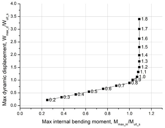 Internal bending moment and vertical displacement for mid-span box girder M2 at load duration time Td = 0.016 s (Data label denotes Md/Mult_s).