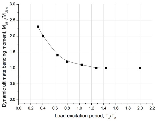 Based on the FE results evaluated by proposed criterion, the relationship of dynamic ultimate moment ratio Mult_d/Mult_s and the load excitation period ratio Te/T0 is plotted in Figure 20. When the load duration time ratio increases, the dynamic ultimate moment ratio gradually decreases.