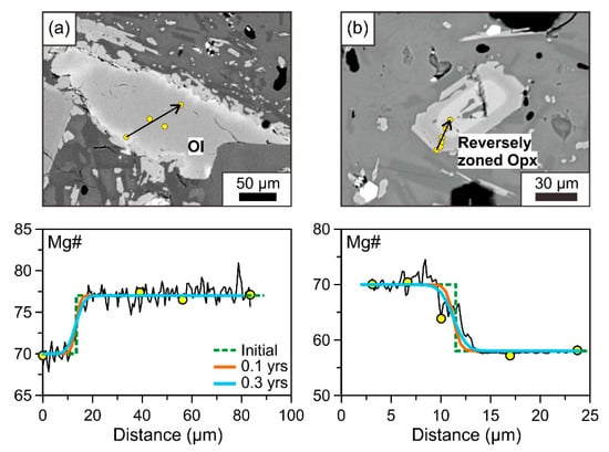 - Coombs, M.L.; Gardner, J.E. Reaction rim growth on olivine in silicic melts: Implications for magma mixing. Am. Mineral. 2004, 89, 748–758. [Google Scholar] [CrossRef]