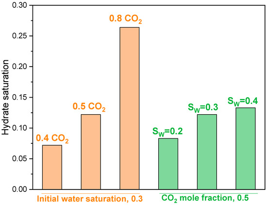 - Gas composition is the key factor affecting hydrate formation and transformation. Hydrate saturation gradually increases with increasing CO2 mole fraction in the gas mixture. However, due to the decrease in driven force during hydrate formation, the obtained hydrate saturation data with different gas composition were limited in a narrow range.