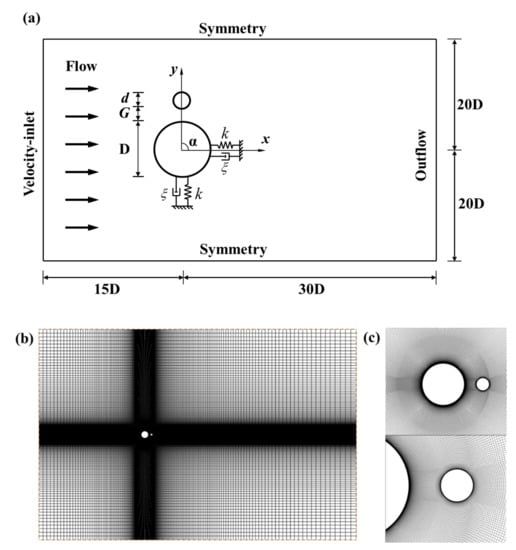 The schematics of computational domain of two coupled cylinders system: (a) sketch of the computational model (α = 90°); (b) computational mesh (α = 0° and d/D = 0.3); (c) mesh details around two coupled cylinders.