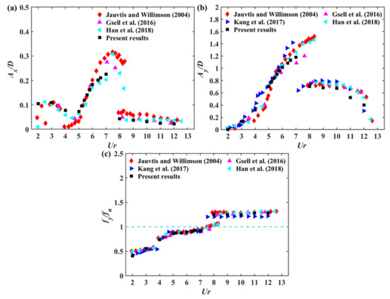 To validate the accuracy of present numerical model, comparisons of the 2-DOF VIV of an isolated cylinder from the present numerical simulation with reported experiment and numerical results were performed. In the numerical validation, the simulation parameters were kept consistent with those used in the experiment of Jauvtis and Williamson [2], D = 0.0381 m, = 2.6, = 0.003611 and the natural frequency = 0.4, the Reynolds number varied from 1500 to 10,000.