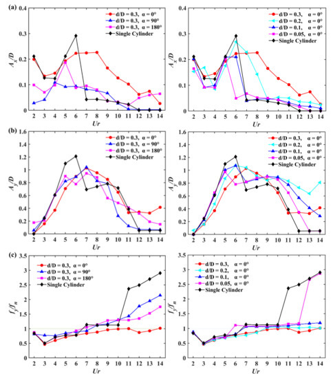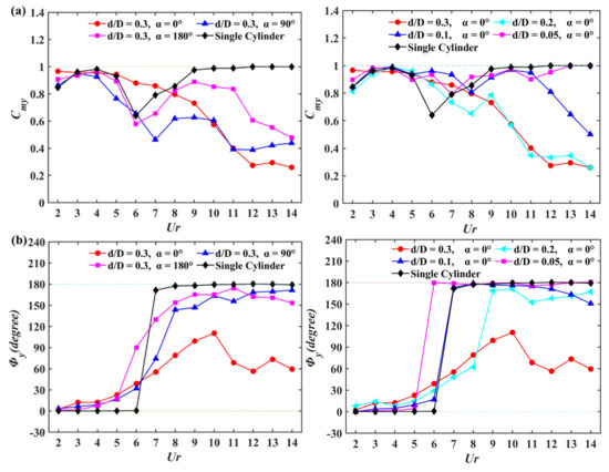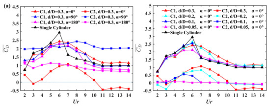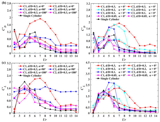 For α = 0°, with the decrease in d/D, the variations in the force coefficients with Ur for the large cylinder are similar to those of the isolated cylinder. As shown in Figure 5a, the mean drag coefficient of the large cylinder reaches the peak value at Ur = 6 as d/D decreases to 0.1 or 0.05, consistent with that of the isolated cylinder. When d/D decreases to 0.05, the maximum value of becomes smaller. Moreover, it is interesting to note that the of the small cylinder approaches to 0 for d/D = 0.05. For d/D = 0.1, although the variations in for the large cylinder are most similar to the single cylinder among all configurations, the small cylinder is subject to a certain amount of drag force for 4 ≤ Ur ≤ 6 and the values of and are kept at larger values for 5 ≤ Ur ≤ 6.