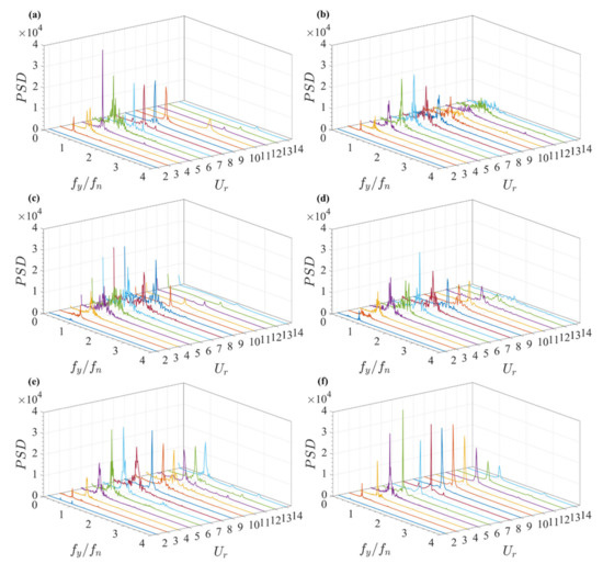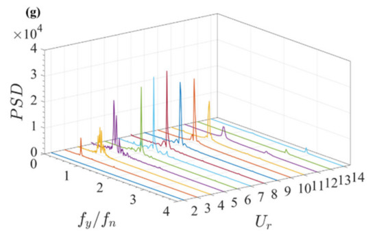 The normalized Fast Fourier Transform (FFT) amplitude spectra of the transverse displacement are presented as functions of Ur and fy/fn in Figure 4. For d/D = 0.3, the peak is not obvious due to the presence of small cylinder, especially at high reduced velocities. Compared with the isolated cylinder, the frequency ratio fy/fn for the dominant peak is varied from 0.7 to 1.0 in the lock-in region 7 ≤ Ur ≤ 14 at α = 0°. Meanwhile, the spectra of the transverse displacement for two coupled cylinders have a wide bandwidth with multiple peak frequencies for 4 ≤ Ur ≤ 10. A similar phenomenon is also observed for other incident angles in Figure 4c,d. The appearance of multiple peaks may be caused by the interference between the reattachment of shear layers and shed vortices. The proximity interferences between two coupled cylinders lead to the irregularities of lift force and vibration amplitude. The peak becomes more obvious with the decrease in d/D compared with that of α = 0°. The coupled cylinders can be regarded as a single bluff body for d/D = 0.05, and a single distinct peak is generally observed in the power spectrum for the single bluff body mode. As shown in Figure 4f, the frequency ratio fy/fn for the dominant peak is varied from 0.8 to 1.2 for 6 ≤ Ur ≤ 14. The peak response is different from that of the isolated cylinder at high reduced velocities 11 ≤ Ur ≤ 14. For d/D = 0.05, the frequency ratio fy/fn for the dominant peak is varied from 2.6 to 2.9 for 13 ≤ Ur ≤ 14. It can be seen that two coupled cylinders for the configuration of d/D = 0.05 and α = 0° exhibit similar features to the isolated cylinder, indicating the weak effect of the small cylinder on the large cylinder.