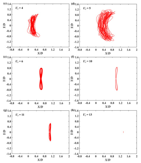 X-Y trajectory of two coupled cylinders at α = 0° and d/D = 0.05: (a) Ur = 2; (b) Ur = 3; (c) Ur = 4; (d) Ur = 5; (e) Ur = 6; (f) Ur = 10; (g) Ur = 11; (h) Ur = 13.
