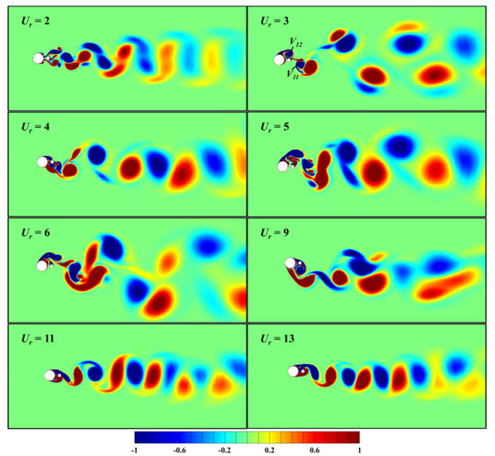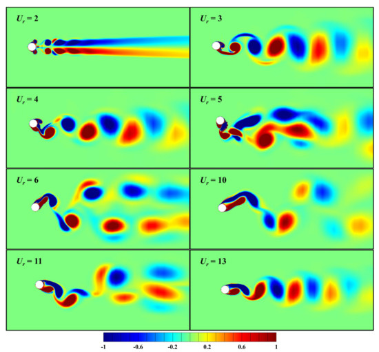 For the case of d/D = 0.05 and α = 0° as shown in Figure 14, with the decrease in the diameter ratio, the flow field becomes more regular. A symmetric pair of vortices is observed at Ur = 2. As Ur increases to 3 ≤ Ur ≤ 4, a 2S mode is observed obviously. For Ur = 5, the flow field becomes slightly irregular, and the vortex pattern is similar to a P+S mode. The vortices shed from the small cylinder suppress the normal formation and development of vortices shed from the large cylinder. As the reduced velocity further increases to 6 ≤ Ur ≤ 10, the vortex pattern becomes a 2P mode, corresponding to the lower branch. With the increase in reduced velocities, the vortex shedding pattern changes to a 2S mode for Ur ≥ 13. The variation in the wake flow patterns of two coupled cylinders is similar to that of an isolated cylinder, which indicates that the effect of small cylinder on the coupled system becomes weakened with the decrease in the diameter ratio.