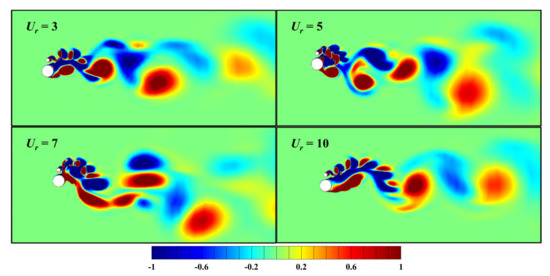 For the case of d/D = 0.3 and α = 90°, the presence of the small cylinder plays an important role on the vortex shedding from the large cylinder, resulting in a more complex and chaotic flow field. The vortices shedding from two coupled cylinders are amalgamated. A pair of vortices is shed from the rear side of the two coupled cylinders and a triplet or quadruplet is observed on the upside. The wake flow pattern is significantly irregular at different reduced velocities. For α = 180° shown in Figure 13, the wake flow pattern can be classified as 2S at Ur ≤ 4. As Ur increases to 7, similar to the case of α = 90°, the vortex shedding from the surface of small cylinder is amalgamated with the shear layer on the upper side of large cylinder. The vortices shed from the small cylinder significantly affect the vortex shedding pattern of two coupled cylinders. For Ur ≥ 10, the vortices attach to the surface of the large cylinder for a long period and the vortex formation length increases compared with Ur ≤ 9, which indicates that the transverse displacement decreases with slower separation of shear layer.