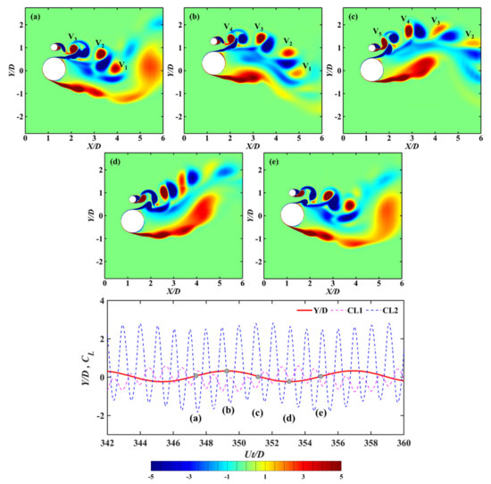 The instantaneous vorticity contours for d/D = 0.05, α = 0°, and Ur = 6 are shown in Figure 17. When two coupled cylinders move to the uppermost position, a pair of vortices is formed above small cylinder and interact with the upper shear layer of large cylinder. The vortices shed from the two lateral sides of the small cylinder with opposite sign are canceled out, resulting in the drag coefficients of small cylinder being almost zero. As can be seen from Figure 17b–d, the small cylinder is always surrounded by vortices of the large cylinder when the cylinders move from the uppermost position to the lowest position. The vortex pattern of the coupled cylinders is similar to that of a single cylinder, and the coupled cylinders can be regarded as a single bluff body. Although the vortex shedding of the large cylinder appears not to be significantly affected by small cylinder, the presence of small cylinder has an effect on the fluctuation of the lift coefficients of two cylinders.