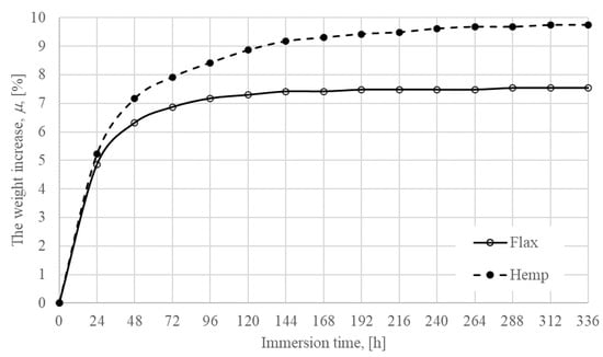 The mass increase due to the seawater absorption was measured every 24 h, and its portion was determined using Equation (1). The results are represented graphically in Figure 1. The absorption rates of flax/epoxy and hemp/epoxy calculated from the slope of the linear section of the graphs were 0.20 %/h and 0.22 %/h, respectively. It is obvious that the kinetics of seawater absorption during the first 24 h of immersion were comparable regardless of the reinforcement type. The saturation of flax/epoxy and hemp/epoxy was reached after approximately 144 and 240 h, respectively. Since the maximum mass increase of flax/epoxy was 7.5% and that of the hemp/epoxy was about 9.8%, the seawater absorption capacity of hemp/epoxy was 30% higher.