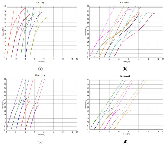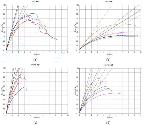 Figure 2. Stress–strain test results for 6 samples under tensile load: (a) flax/epoxy dry, (b) flax/epoxy wet, (c) hemp/epoxy dry, and (d) hemp/epoxy wet. (The 1% shift along the x-axis is intentional and allows better clarity of the results. Each sample is presented using different colour).
