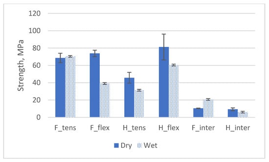 Figure 4. Effect of seawater treatment on tensile (tens), flexural (flex), and apparent interlaminar shear strength (inter) of flax/epoxy (F) and hemp/epoxy (H).