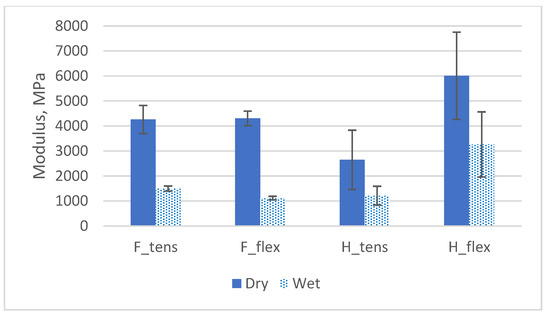 Similar conclusions related to tensile and flexural testing of flax/epoxy and hemp/epoxy in dry and wet conditions may be found in the literature. However, many available results are conditioned to the specific manufacturing procedure and fiber fractions that are different from those considered here. Nevertheless, their comparison is noteworthy as it may indicate factors other than fiber type directly influencing mechanical properties. Hence, we compare the measured mechanical properties separately, i.e., flax/epoxy with the results presented in [44], and hemp/epoxy with those presented in [26].