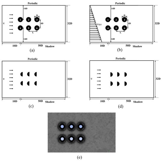 General view on the computational domain: (a) shape 1 cylinder immersed in the uniform flow; (b) shape 1 cylinder immersed in the linearly sheared flow; (c) shape 2 cylinders immersed in the uniform flow; (d) shape 3 cylinders immersed in a uniform flow; (e) mesh of the computational domain.