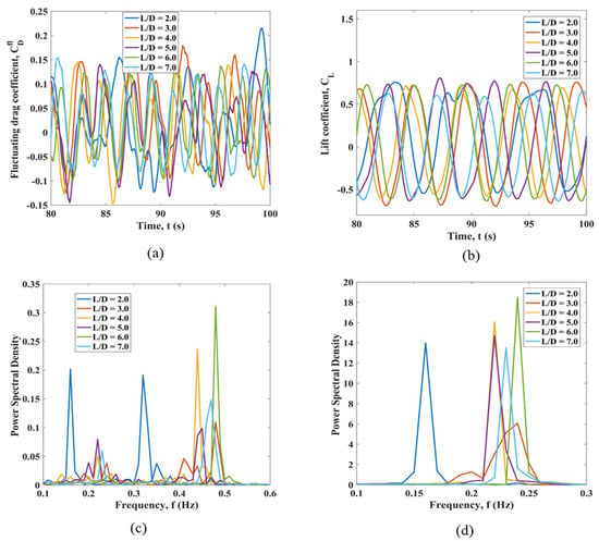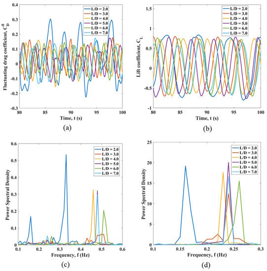 Results for the fluctuations of hydrodynamic force coefficients for the first structure C1 for the considered L/D ratios in comparison are presented in Figure 2, and results for the remaining five structures are given in Appendix A, Figure A1, Figure A2, Figure A3, Figure A4 and Figure A5. These figures each include the signal of the fluctuating drag coefficient, lift coefficient, and frequency spectra of both coefficient signals in comparison. It is possible to see from Table 2 and the figures that, at L/D = 3, the majority of cylinders experience the least mean drag. At the same time, the highest fluctuating drag is observed for the majority of structures at L/D = 2. The upstream cylinders C1 and C4 experience, on average, a higher mean drag force compared to that of the mid- and downstream cylinders, which is related to the immersion of the mid- and downstream cylinders in the wake of the upstream cylinders. This agrees well with the work [12]. The midstream cylinders experience the least mean drag coefficient. Unusual mean drag coefficient values with an increasing spacing ratio are observed for cylinder 5. The downstream cylinders are in the wake region of the frontal cylinders, and the shielding effects are observed in the flow patterns around them. Downstream cylinders achieve the maximum mean drag coefficient of 0.41 at L/D = 2.