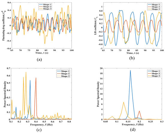Figure 4 and Appendix C show time histories of the hydrodynamic coefficients and the corresponding FFT data for six structures with three considered geometrical shapes under the uniform flow at L/D = 2. Here, the fluctuating drag and lift coefficient signals of the shape 2 cylinders appear more stable and have lower amplitudes than those for the shape 1 and shape 3 cylinders. The fluctuating drag and lift coefficients signals seem very unstable for the shape 3 cylinders. Several dominating peaks are present in the fluctuating drag coefficient signals of the shape 3 cylinders, and a single peak of the dominant frequency is found in the power spectrum density (PSD) of the lift coefficient signals. Moreover, it is possible to note that the hydrodynamic coefficient signals for the cylinders with the third cross-sectional shape have low frequencies in general. The maximum frequencies of the hydrodynamic coefficient signals are observed for the shape 2 cylinders. This, combined with the overall lower amplitudes of the signals and the relatively reduced mean drag coefficient values, allows stating that the cross-sectional shape 2, especially for the mid- and downstream structures provides the suppression effect of hydrodynamic loads. This result is quite consistent with the data reported in [30].