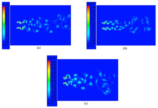 Vorticity contours for the uniform flow simulations at L/D = 2 for the cylinder of a variative cross-section: (a) Shape 1; (b) Shape 2; (c) Shape 3.
