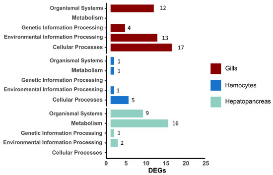 In gills, 2195 and 809 DEGC were detected by EdgeR and DESeq2, respectively, and 400 unigenes were DEGs (Table 3). In hemocytes, 388 and 377 DEGC were detected by EdgeR and limma, respectively, and 84 unigenes were DEGs (Table 3). In hepatopancreas, 767 and 1854 DEGC were detected by EdgeR and limma respectively, and 434 unigenes were DEGs (Table 3). We mapped DEGs to the KEGG level1 category (Figure 1). When compared with the other two tissues, DEGs in gills were enriched in “Environmental Information Processing” and “Cellular Processes”, DEGs in hemocytes were mainly enriched in “Cellular Processes”, while those in hepatopancreas were mainly enriched in “Metabolism”.