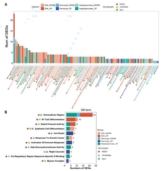 (A) Distribution of GO terms in all DEGs annotated in the gills, hemocytes, and hepatopancreas of P. vannamei under WSSV, VPAHPND, or DIV1 infection. (B) GO terms of DEGs in the gills, hemolymph, and hepatopancreas that are shared between at least two of the three pathogen infections. The colors of the bars represent the tissue types and expressional changes (down- or up-regulated). The icons next to the KEGG level 3 categories indicate the types of infection.