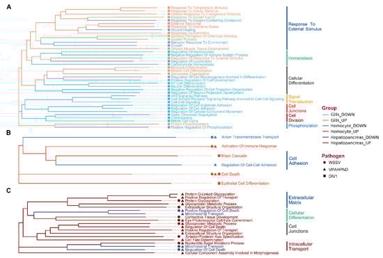 GO clustering diagram based on DEGs functional similarity in (A) gills, (B) hemocytes, and (C) hepatopancreas, constructed using the R package GOSemSim (branches that shared low functional similarity with the others were removed to reveal critical processes involved in the shrimp’s immunity). DEGs functional categories are grouped according to functional themes. The colors of the branches indicate tissue types and expressional changes (down- or up-regulated), while icons at the tip indicate the types of infection.