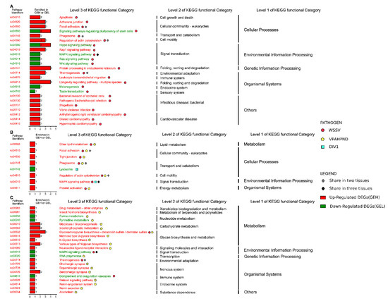 Results of KEGG enrichment analysis of DEGs in (A) gill, (B) hemocytes, and (C) hepatopancreas in WSSV, VPAHPND, or DIV1 infected P. vannamei, showing the pathway identifiers, the numbers of up-regulated DEGs (GEH, in red) and down-regulated DEGs (DEL, in green), and the corresponding KEGG level 3, 2 and 1 functional categories. The icons next to the KEGG level 3 categories indicate the types of infection, with grey diamond indicating the KEGG level 3 categories enriched in two of the tissues (gills and hemocytes or hepatopancreas), while the black diamond indicates categories enriched in all three tissues. DEGs were first assigned to a specific KEGG pathway level 2, then assigned to either one of the five KEGG level 1 category (i.e., organismal systems, metabolism, genetic information processing, environmental information processing, and cellular processes).