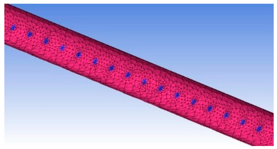 There are 18 aquaculture cabins on the aquaculture ship, and the typical aquaculture cabin (aquaculture cabin No. 7) is taken as the research object, as shown in Figure 1. The length, width, and height of the aquaculture cabin are 15.34 m × 16.60 m × 17.00 m, respectively, with 33 round holes arranged in the vertical direction of the inlet pipe, and the diameter of the round hole can be adjusted according to the flow rate. The space of the aquaculture cabin was divided into grids, and the details of the inlet and outlet were calculated. The grid distribution is shown in Figure 2, Figure 3 and Figure 4, and the total grid number of the aquaculture cabin is 2.6 million. The grid number for the water inlet pipe is 107,300 and the grid number for the water inlet is 137,000. The grid number for the water outlet pipe is 56,000, while the grid number for the middle pipe outlet is 15,000. Finally, the grid number for the bottom outlet is 35,000 and the grid number for the top outlet is 26,000.