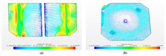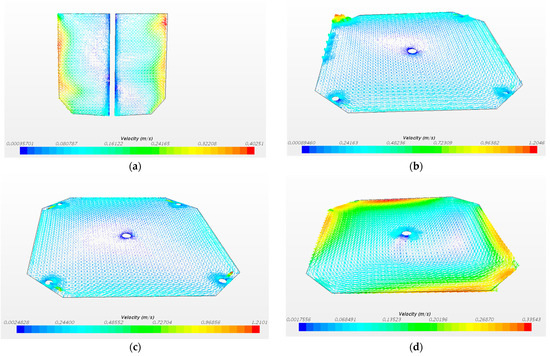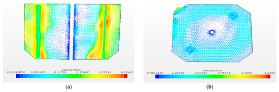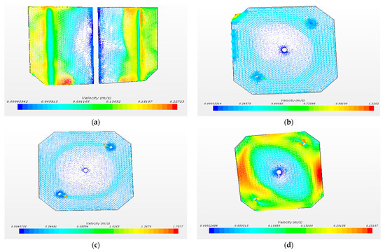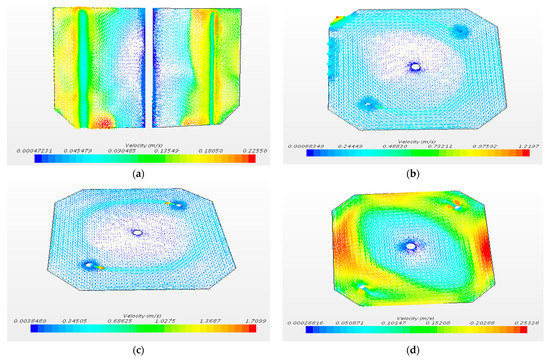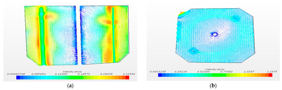 As shown in Figure 17, the particle emission process in the cabin was simulated and the velocity field at four cross-section positions in the cabin was intercepted under the condition of 40% drainage at the bottom of the aquaculture cabin.