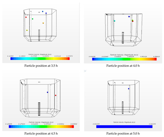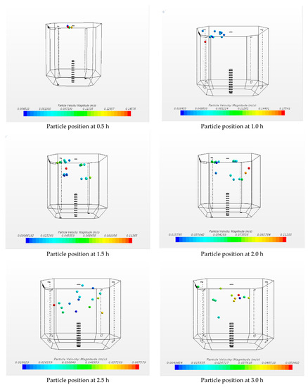 Assuming that the particles are generated from the top, the position of 40 particles in the cabin within five hours was simply tracked. It can be seen from the Figure 7 that the number of particles in the cabin decreases with time. When the particles move to the outlet attachment, they are considered to be discharged, and the discharge efficiency of the particles is calculated accordingly.