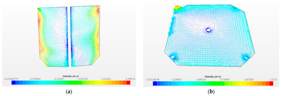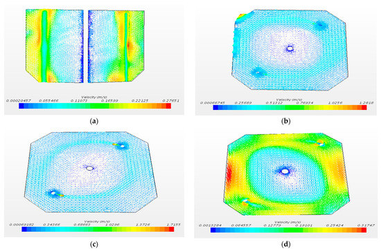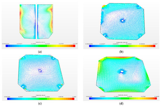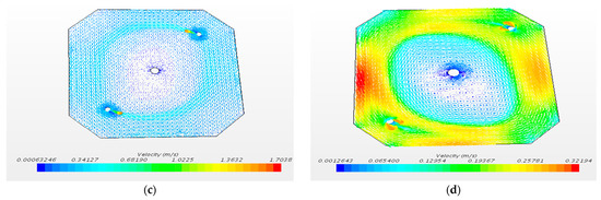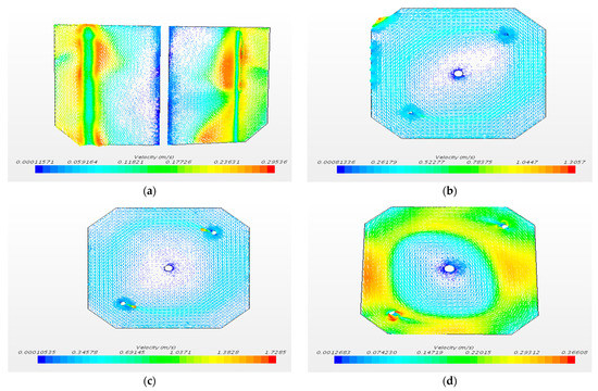 As shown in Figure 15, the particle emission process in the cabin was simulated and the velocity field at four cross-section positions in the cabin was intercepted under the condition of 10% drainage at the bottom of the aquaculture cabin.
