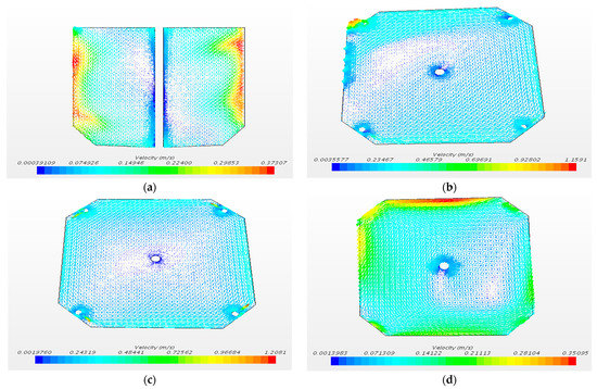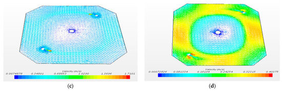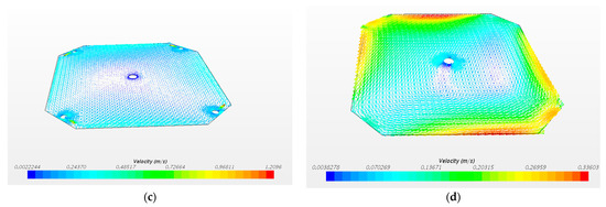 As shown in Figure 20, the particle emission process in the cabin was simulated and the velocity field at four cross-section positions in the cabin was intercepted under the condition of 10% drainage at the bottom of the aquaculture cabin.