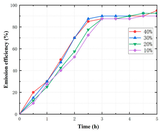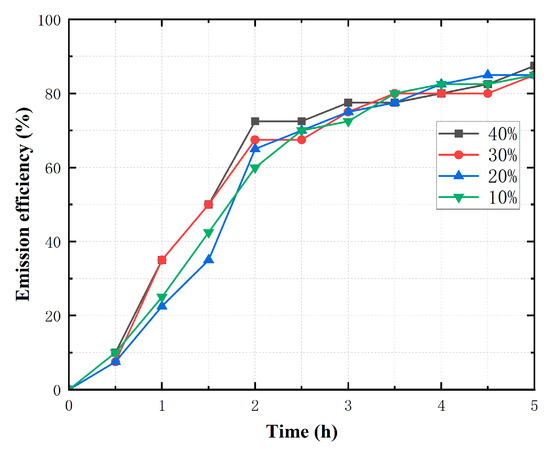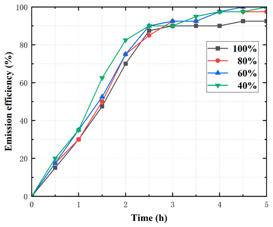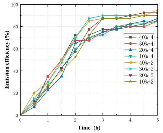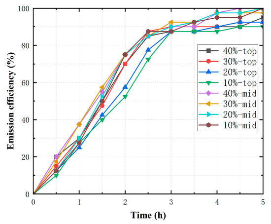 In the case of the above two inlet pipes, the emission efficiency curves of the four bottom drainage volumes under different working conditions are shown in the following Figure 16.