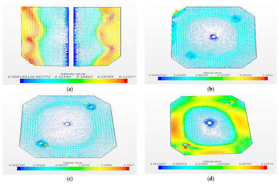 As shown in Figure 10, the particle emission process in the cabin was simulated and the velocity field at four cross-section positions in the cabin was intercepted under the condition of 10% drainage at the bottom of the aquaculture cabin.