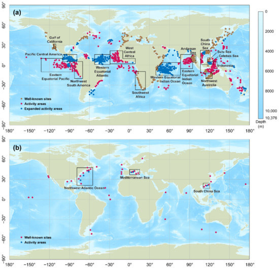 Nonlinear internal wave and nepheloid layer distribution around the world. (a) Global internal waves observed in MODIS imagery from 2002 through 2004, adapted from Jackson [13]. (b) Global nepheloid layers observed from 1953 through 2019, adapted from Tian et al. [14]. The well-known sites are regions where internal waves or nepheloid layers have been previously reported and their characteristics well-documented. The activity areas are regions where internal wave or nepheloid layer activity has been reported but their characteristics have not been determined. The expanded activity areas are regions in which the MODIS survey found a significant amount of internal wave activity where little or no activity had been previously reported.