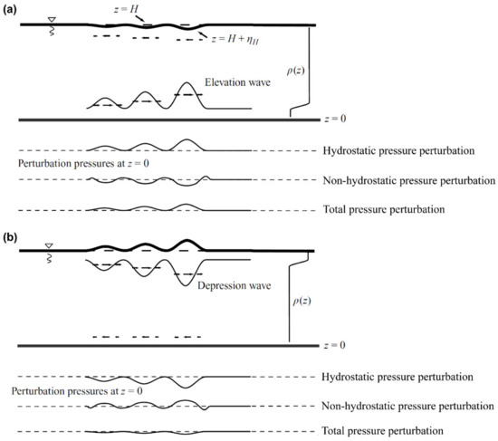 Theoretically, bottom pressure disturbance caused by NLIWs has been investigated previously as a problem in density and velocity changes of the water column [23,43,46,47]. As mapped by Moum and Smyth [46], the wave pressure structure of the seafloor consists of three components (as in Figure 2):