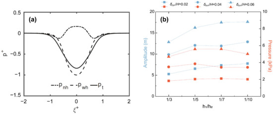 Bottom pressure induced by internal solitary waves for different environmental parameter schemes. (a) ISW-induced bottom pressure with a thickness ratio of . The dash–dash line, dash–dot line, and solid line show the hydrostatic pressure, the non-hydrostatic pressure, and the summation of the above, respectively. (b) Amplitude and pressure changes of ISWs for the different ratios of pycnocline thickness and the ratio of upper and lower water depths. Panel (a) adapted from Rivera-Rosario et al. [21], with permission from Wiley. And the data of panel (b) come from Table 2 of Rivera-Rosario et al. [21].