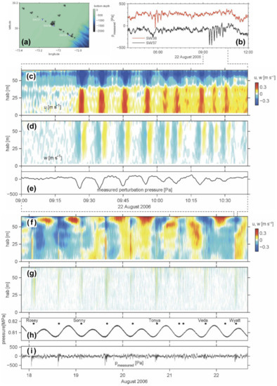 Seafloor pressure measurements of NLIWs on the New Jersey shelf. (a) Mooring locations of SW37, SW38, and SW39 where bottom pressure observations were conducted. (b) The NLIW named Wyatt induces bottom pressures at SW37 and SW38, respectively. Note the bottom pressure signals have been offset for clarity. For NLIW Wyatt, comparison between horizontal velocity (c), vertical velocity (d), and bottom pressure (e) at SW37 on 22 August 2006. For all NLIW observed at SW37, comparison between time series of (f) horizontal velocity, (g) vertical velocity, (h) bottom pressure, and (i) filtered bottom pressure from 18 to 23 of August 2006. Dots in (h) show the named NLIWs, including NLIW Wyatt. The hab is expressed as height above the bottom. Panels (a–i) adapted from Moum and Nash [43], with permission from the American Meteorological Society.