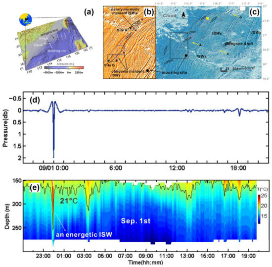 Seafloor pressure of obliquely incident ISWs in the northern South China Sea. (a) Location of the mooring site. (b) Expansion of boxed region in (c). The obliquely incident ISWs (deep brown imprints) near the mooring site are shown in the amplified MODIS image. (c) The MODIS image illustrates the ISWs’ direction. Approximately 2.5 kPa of pressure changes at 10 m above the bottom at the mooring site (d), when the largest fluctuation of 21 °C isotherms is down about 80 m (e), reflecting a crossing energetic ISW propagation. Panels (a–e) adapted from Ma et al. [19], with permission from Wiley.
