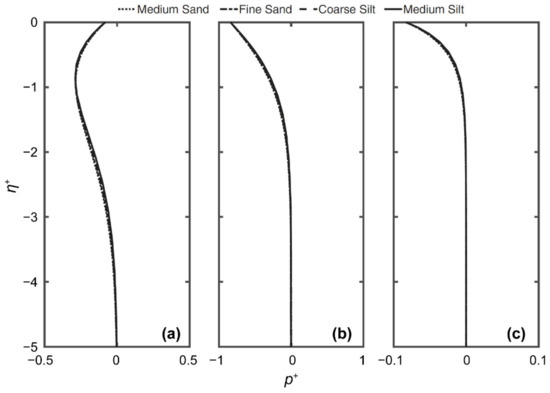 with units of length squared over time. Since the pressure diffusive time scale, , is larger than the time scale of the ISW propagation, , a pore-pressure phase lag inside the seabed will occur after the passage of the wave trough (as shown in Figure 8).