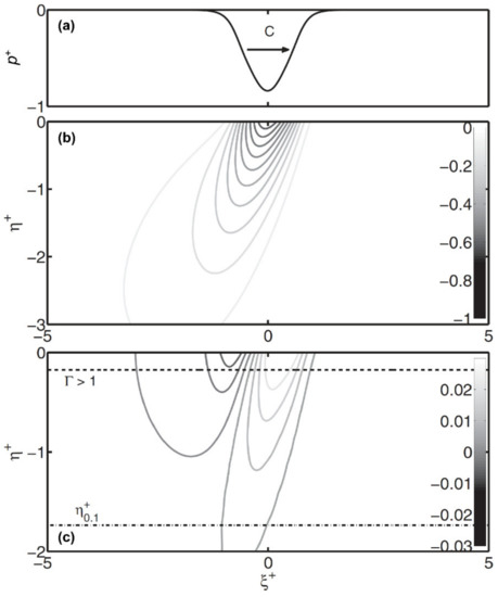 For the stratified water column, the elevation NLIWs can form when the thickness of the upper layer is larger than that of the lower layer [69,72,73]. The mechanisms of seabed failure induced by the elevation NLIWs were argued by Rivera-Rosario et al. [21]. Due to the positive bottom pressure load dominated by hydrostatic pressure [46], related to the pycnocline displacement, positive pore pressure penetrated the seabed as a result of the elevation NLIWs. The vertical pore-pressure gradient was also generated by the elevation NLIWs, but was insufficient to exceed the buoyant unit weight of the sediment [21]. Thus, during the propagation of elevation NLIWs, the wavefront is steep enough to induce a horizontal pore-pressure gradient that is powerful enough to overcome the mobilized internal friction of the seabed and capable of resulting in seabed failure [74]. Based on Equation (17), for a seabed in a fixed reference frame , the dimensional seabed failure criterion can be expressed as
