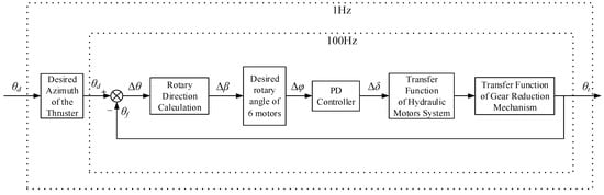 The rotary mechanism of the azimuth thruster belongs to the hydraulic control device, which controls the rotation angle of the thruster by controlling the displacement of the hydraulic motor. The difference between the expected azimuth angle and the actual azimuth angle assigned by the thrust allocation module to the thruster is input to the azimuth angle optimization module, and the angle through which the hydraulic motor needs to rotate is then calculated. The deviation in the rotation angle of the feedback hydraulic motor is then input to the proportional–derivative (PD) controller, and the controller output command is transmitted to the calculation module of the hydraulic pump displacement. The displacement of the hydraulic pump is thus obtained, and the actual rotation angle, angular acceleration and output torque of the motor are obtained through the hydraulic motor module. Finally, the actual azimuth angle of the azimuth thruster is calculated.