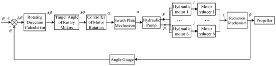 The system mainly controls the rotation of the propeller to meet the thrust direction command issued by the bridge controller, so as to ensure the effective implementation of thrust allocation. The pump-controlled hydraulic rotary dynamic system has two loop systems, as shown in Figure 2.