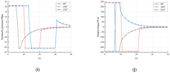 In Figure 5i, without optimization of the rotary direction, the target azimuth angles are 90°, 180° and 270°, and the hydraulic pressure of motors increases from zero to maximum values of 21 MPa, and decreases from 21 MPa to −21 Mpa. In Figure 5j, with the optimization of the rotary direction, the target azimuth angles are 90°, 180° and 270°, the output torque of motors gradually increases from zero to maximum values of 250 N.m and the output torque of motors gradually decreases from 250 N.m to minimum values of −250 N.m. Then, the output torque of motors gradually increases from −250 N.m to 0.