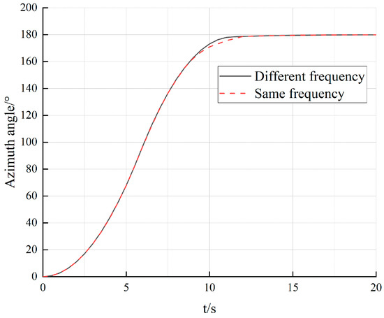 The target azimuth angle of the azimuth thruster is 180°, and two control methods of setting the frequency are simulated: (1) In the inner- and outer-loop synchronous simulation method, the outer-loop control period and inner-loop control period are the same, i.e., . (2) In the inner- and outer-loop asynchronous simulation method, the outer-loop control period is different from the inner-loop control period; i.e., and . The dynamic response of the thruster azimuth is obtained, as shown in Figure 6.