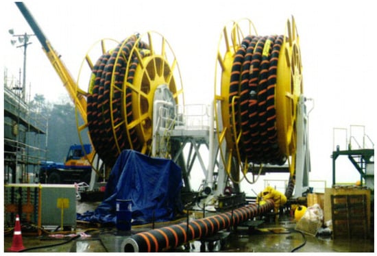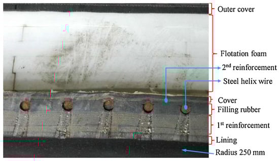 The offshore bonded rubber hose is widely used for oil and gas offloading [,] (see Figure 1). It comprises layers of rubber, fiber reinforcement, and steel wires, which are bonded together through vulcanization, preventing relative sliding []. It may face complex combinations of loading in the lifetime of service. The crush load is one of the load types which should be well considered, as recommended in the OCIMF code []. It is common for the reeled hose and tanker rail hose [].