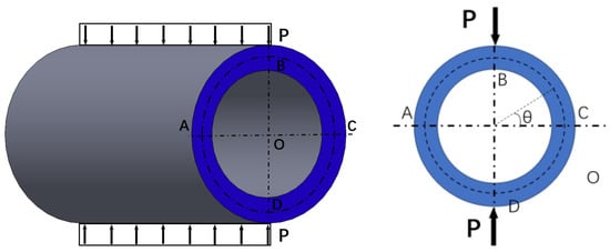 As shown in Figure 4, for a pipe section laterally loaded with a line load P, it could be simplified as a plane stress problem, and the radial displacement on the pipe could be obtained by replacing the bending rigidity EI. The elastic modulus E should be replaced by E/(1 − 2), and the I should be replaced by h3/12, in which h is the thickness of the pipe shell. The displacement between point B and D is the deflection under the load P. Therefore, the crush rigidity can be expressed as Equation (6).