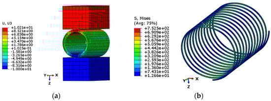 A displacement of 10 mm is loaded to the hose, under which the displacement of the hose and the stress distribution on the steel wire are plotted in Figure 10. It shows the maximum stress of the wire is 752.5 MPa, which is lower than its yield stress, which implies the deformation is in the elastic range. This is also demonstrated by the linear load-displacement relationship which is plotted in Figure 11. It is shown that the displacement increases linearly with the load, which agrees with Qi et al. []. The rate of the curve in Figure 11 is the crush rigidity of the hose. In this case, the crush rigidity of the hose is 1.2 N/mm2.