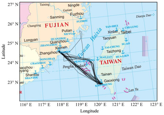 The main ship navigation routes between ports were extracted by ship trajectory fusion, and Figure 10 shows the results in the study area. The extraction results were compared with the Ocean Passages for the World (OPW) [39]. Figure 11 shows some routes in the Taiwan Strait included in the OPW map. The maps in Figure 11 were superimposed to obtain a complete route map in the Taiwan Strait. The overlay results are shown in Figure 12.