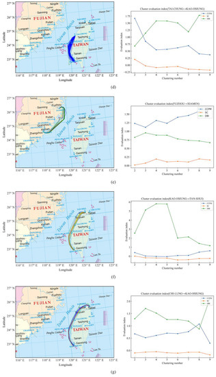 (a) Clustering results of ship trajectories from Kaohsiung Port to Fuzhou Port, and four groups of ship trajectory clusters were obtained. (b) Clustering results of ship trajectories from Kaohsiung Port to Xiamen Port, and three groups of ship trajectory clusters were obtained. (c) Clustering results of ship trajectories from Xiamen Port to Kaohsiung Port, and two groups of ship trajectory clusters were obtained. (d) Clustering results of ship trajectories from Taichung Port to Kaohsiung Port, and two groups of ship trajectory clusters were obtained. (e) Clustering results of ship trajectories from Fuzhou Port to Xiamen Port, and nine groups of ship trajectory clusters were obtained. (f) Clustering results of ship trajectories from Taoyuan Port to Kaohsiung Port, and nine groups of ship trajectory clusters were obtained. (g) Clustering results of ship trajectories from Keelung Port to Kaohsiung Port, and eight groups of ship trajectory clusters were obtained. (h) Clustering results of ship trajectories from Taichung Port to Keelung Port, and six groups of ship trajectory clusters were obtained.