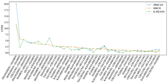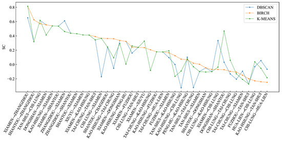 In order to verify the difference of clustering effect between the enhanced BIRCH algorithm and mainstream ship trajectory clustering algorithms, the K-Means algorithm [40] and the DBSCAN algorithm [41] were selected as counterexamples. Table 6 gives the descriptions of the three clustering algorithms. The K-Means algorithm, DBSCAN algorithm, and enhanced BIRCH algorithm were compared under the same conditions (i.e., the input data are all ship trajectories in the Taiwan Strait waters) for ship trajectory clustering and evaluation, and the SC, DBI, and CCPM evaluation indices are calculated for each port pair. The results are shown in Figure 13, Figure 14 and Figure 15.