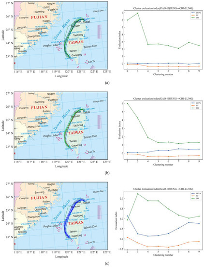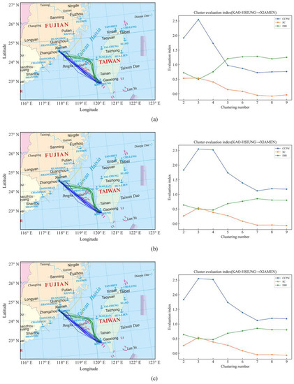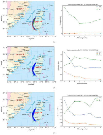 Taking the ship trajectories with big differences in spatial distribution from Kaohsiung Port to Xiamen Port as an example, the three clustering algorithms (K-Means, DBSCAN, and BIRCH) were used to cluster the ship trajectories, and the evaluation results are shown in Figure 16a–c. It can be seen that all three clustering algorithms gave similar and quality clustering results and the fluctuations and peaks of each evaluation index were obvious, which demonstrates that for ship trajectories with big differences in spatial distribution, all three clustering methods are competent.