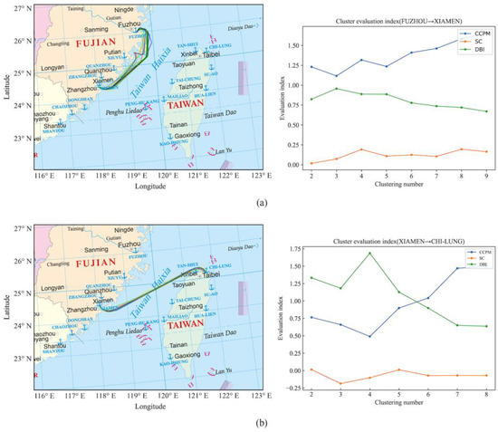 (a) BIRCH clustering results and quantitative evaluation results of the ship trajectories from Fuzhou Port to Xiamen Port. (b) BIRCH clustering results and quantitative evaluation results of the ship trajectories from Xiamen Port to Keelung Port.